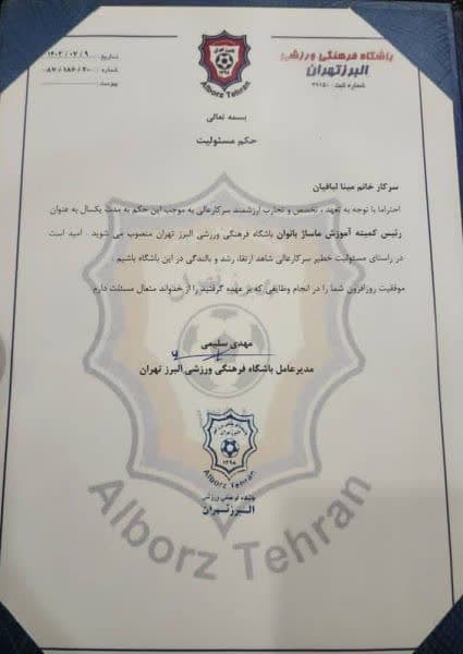 احتراما با توجه به تعهد ، تخصص و تجارب ارزشمند سرکارعالی به موجب این حکم به مدت یکسال به عنوان رئیس کمیته آموزش ماساژ بانوان باشگاه فرهنگی ورزشی البرز تهران منصوب می شوید.